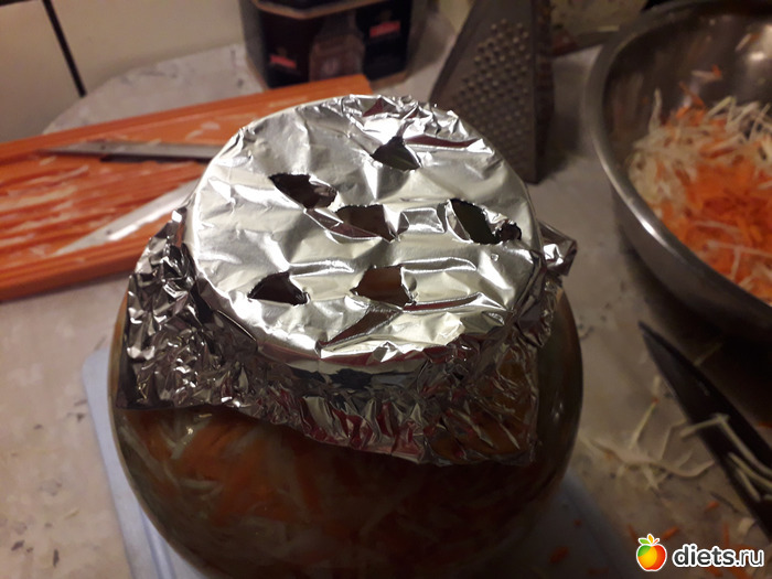 11. 24.12 снимаю фольгу и протыкаю капусту в банке деревянной палочкой чтобы вышел воздух (результат брожения, если этого не делать, то капуста будет горькой)