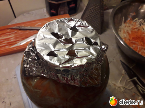 1. Нам понадобится 2 больших кочана капусты, соль крупная, сахар, морковь, 3л. банка, тазик, кусок фольги, пакет и больше ничего