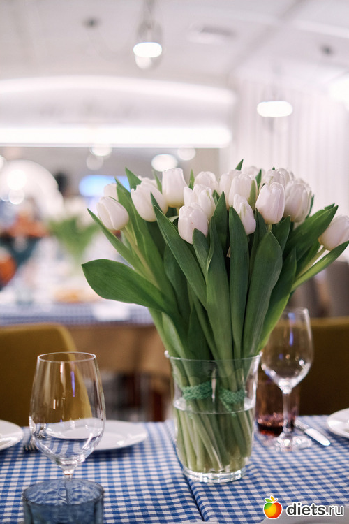 Белые тюльпаны - любимые цветы подруги, а так как она занимается оформлением свадеб и т.д., то зал она украшала сама. В конце торжества каждой женщине с собой она давала букет тюльпанов.