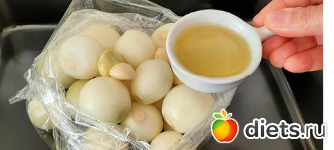 Перекладываем лук в рукав для запекания, туда же кидаем зубчики чеснока. Поливаем все оливковым маслом, солим. Закрываем рукав, ставим в духовку на 10 минут при 200 градусах.