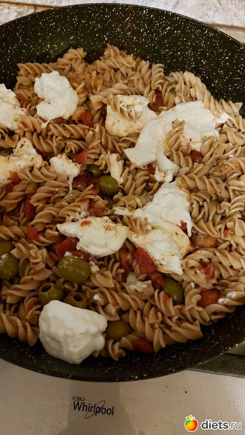 Во второй раз покупали буррату, тогда клали в салат, в этот раз - в макароны. Не очень диетично, но безумнейше вкусно