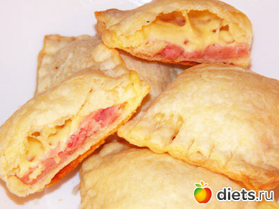 1. Ветчину и сыр нарезать прямоугольными небольшими кусочками. Каждый кусочек должен быть такого размера, чтобы поместиться на половину раскатанного кусочка слоеного теста для пирожка, оставив место для его защипывания.