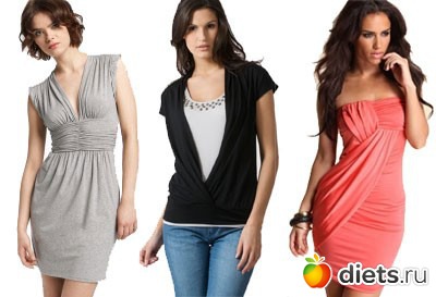 Подойдут платья из простых тканей с овальным вырезом, приталенные рубашки, топы и кофты с v - образным вырезом.