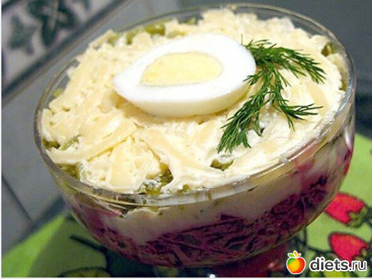 5. Собираем салат: сначала горошек, потом свекла, яйца, огурцы, сыр.