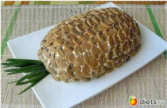 Для украшения шампиньоны нарезать тонкими пластинками. Верхний слой салата хорошо смазать майонезом и украсить пластинками грибов, укладывая в виде черепицы. Сделать верхушку "ананаса" из перьев зеленого лука.