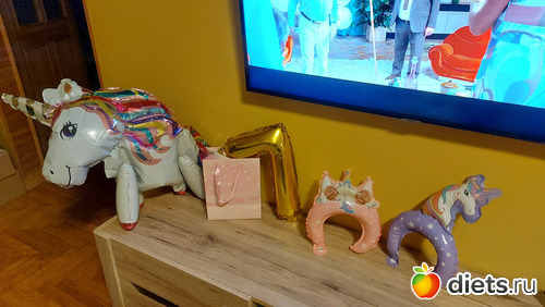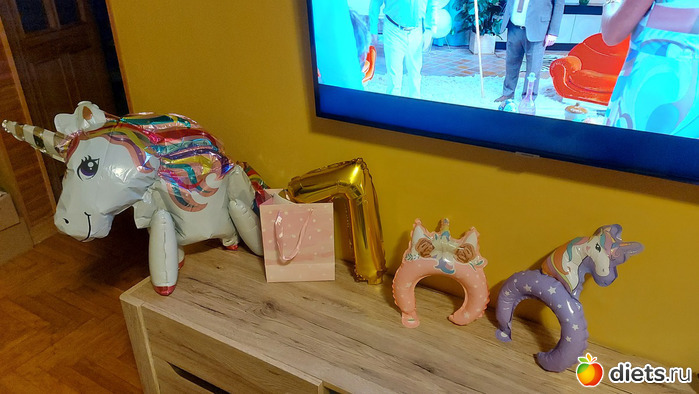 Когда дети заснули, мы надули шарики, единорога, запаковали подарки. Упаковочную бумагу взяли тоже в принт единорожку