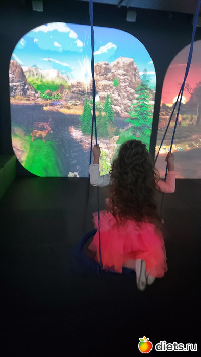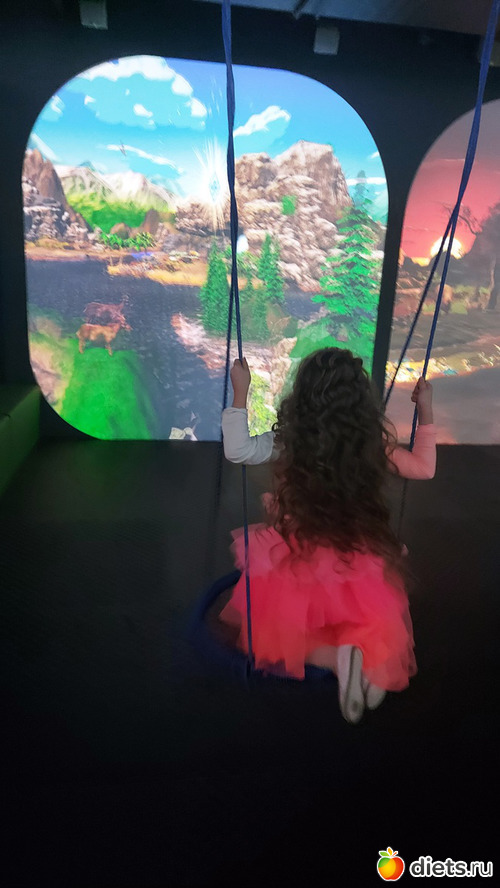 Качаясь на качелях напротив экрана создается впечатление, что пролетаешь то над джунглями, то над саванной, то над северным полюсом и тд