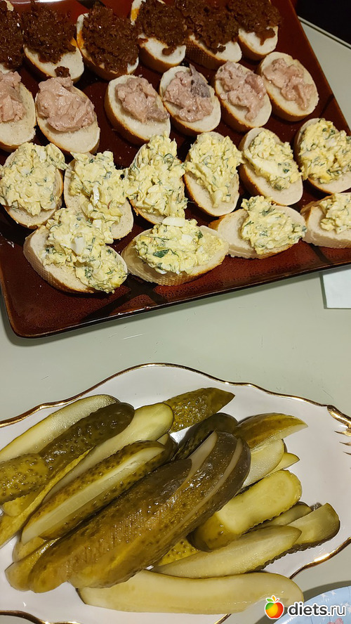 Намазки на багет: вяленые помидоры с маслинами, печень трески, домашняя самодельная из яиц. Маринованные огурцы