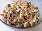 1. Грибы порезать дольками и обжарить на растительном масле. Лук нарезаем на небольшие кубики и обдаем кипятком для мягкости вкуса. Кальмаров очищаем, кладем в уже кипящую воду. Варим не более 2-3 минут.