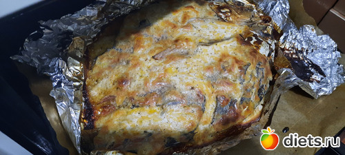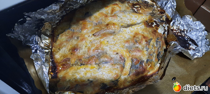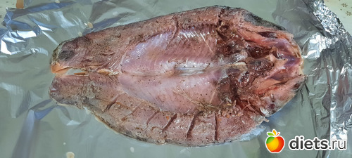 на подушку-тушку сазана, шкуркой вверх, чтобы запеклась получше, фольгу чуть подвернула, чтобы ничего не вытекало,