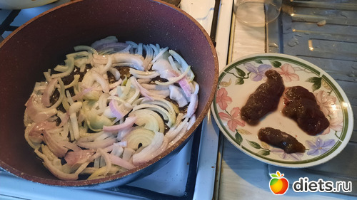 Зажарка: Тем временем порезала репчатый лук, обжарила его на подсолнечном масле, в рыбе обнаружилось что-то похожее на икру,