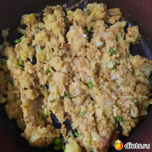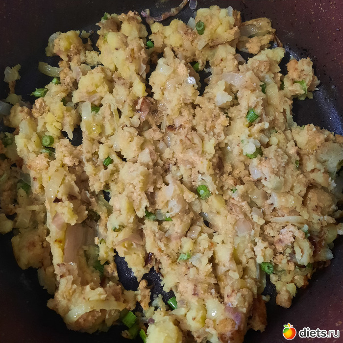 3. весь коктал или запечённый сазан в интернете идёт с картофелем... у меня в холодильнике было чуть пюре... добавила его к зажарке, +порезала туда укропчик, в общем, получилась такая милая