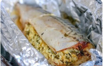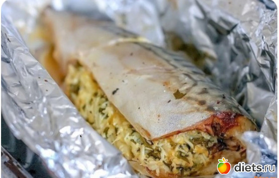 Скумбрию выложите на фольгу и нафаршируйте начинкой. Заверните каждую рыбку в фольгу и положите на противень.