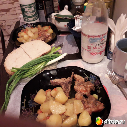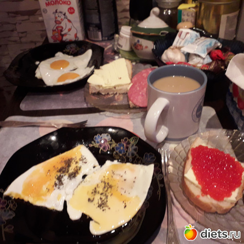 Баклажанная икра, чай с молоком-у меня, у мужа-кефир