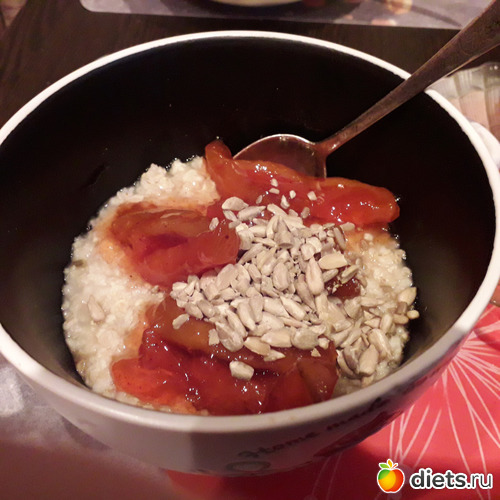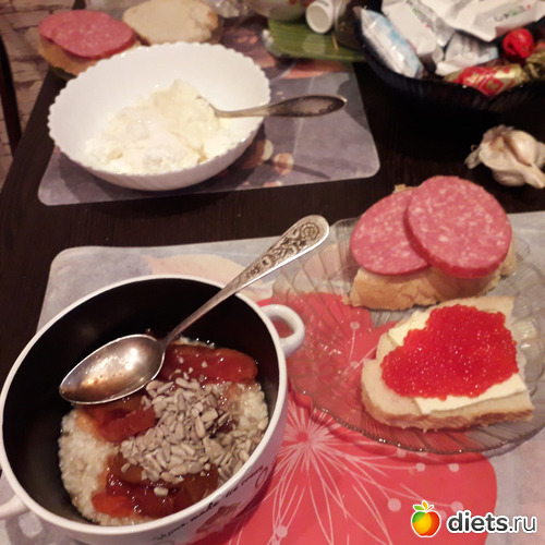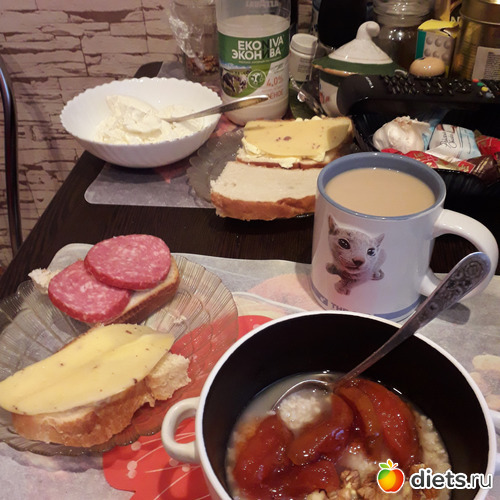 Геркулесовая каша на воде с семечками и айвовым мармеладом-у меня. Бутерброды, кофе с молоком