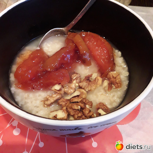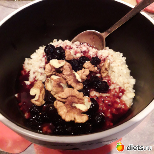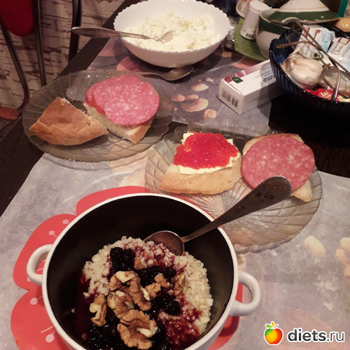 -У меня-геркулесовая каша на воде с вареньем и грецкими орехами, у мужа-домашний творог со сметаной. Бутерброды, кофе с молоком