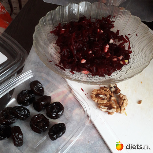 Свеклу с черносливом и орехом сто лет не делала, надо приготовить, тем более вареная свекла где-то в холодильнике болтается как раз