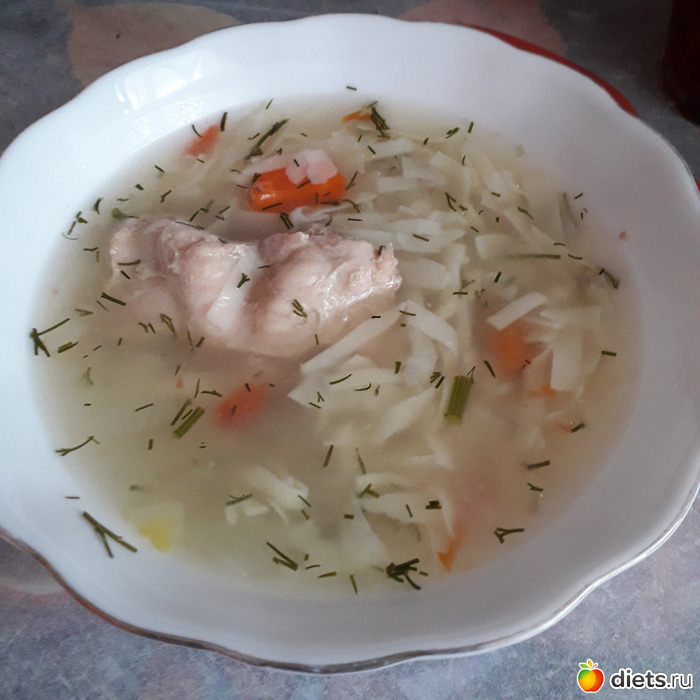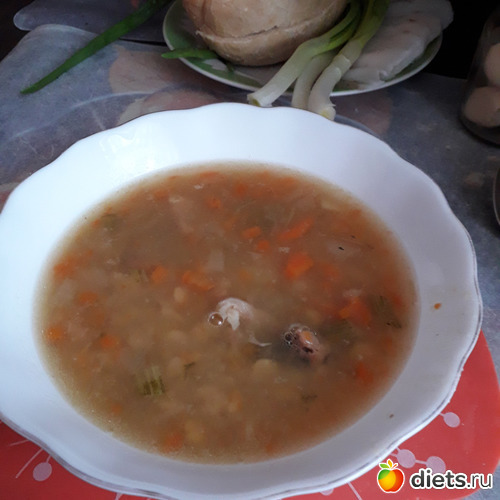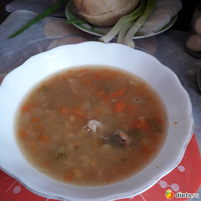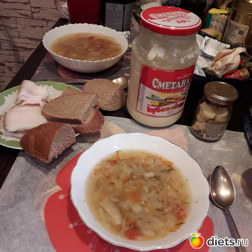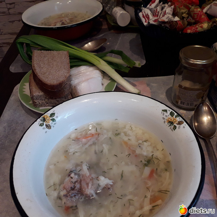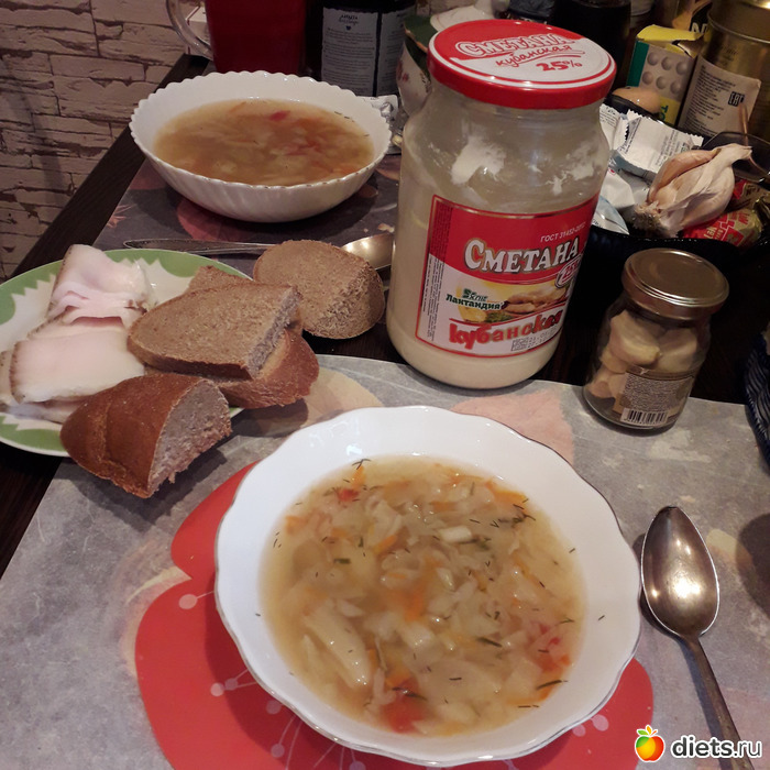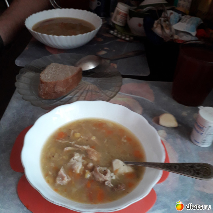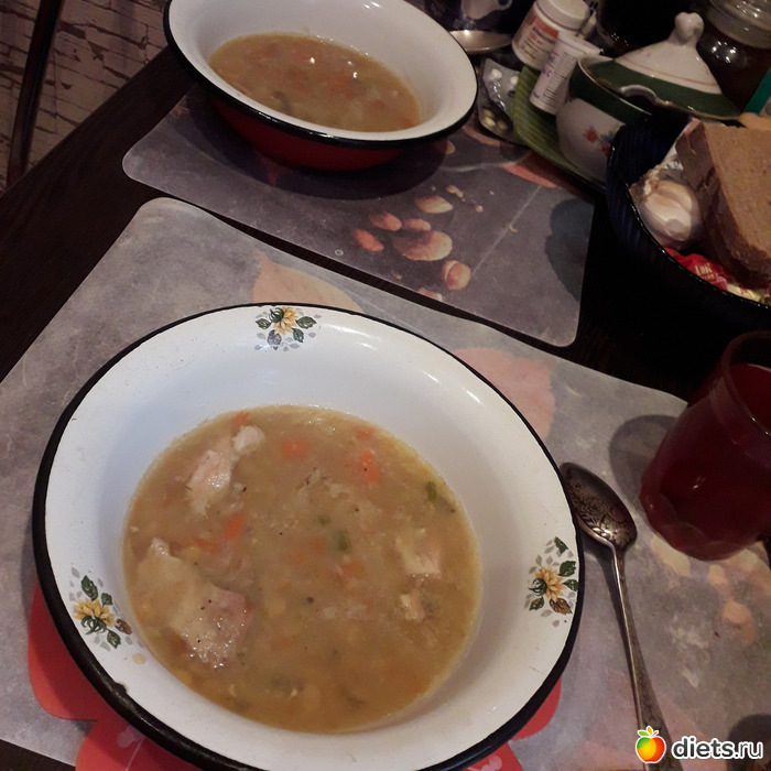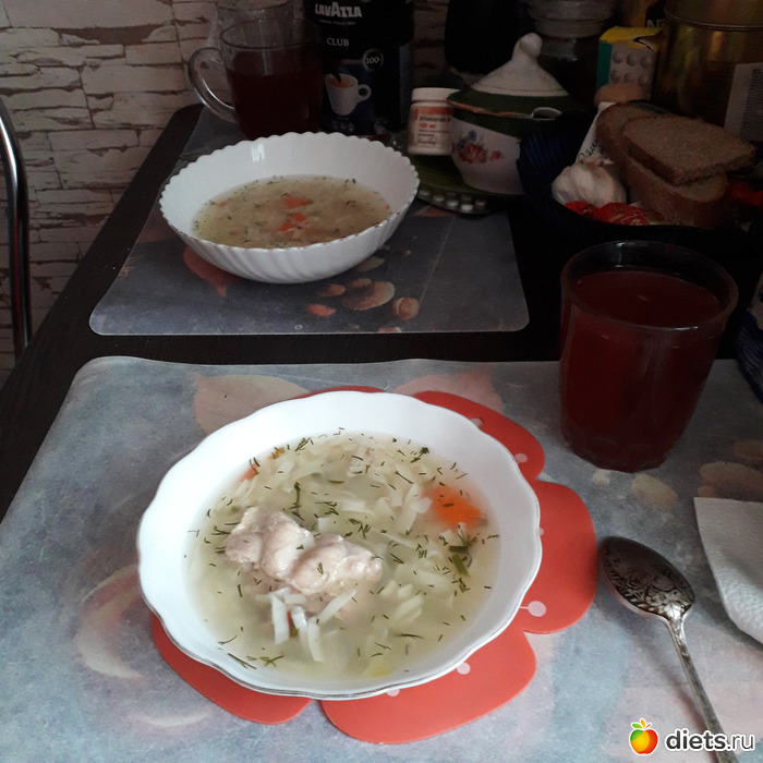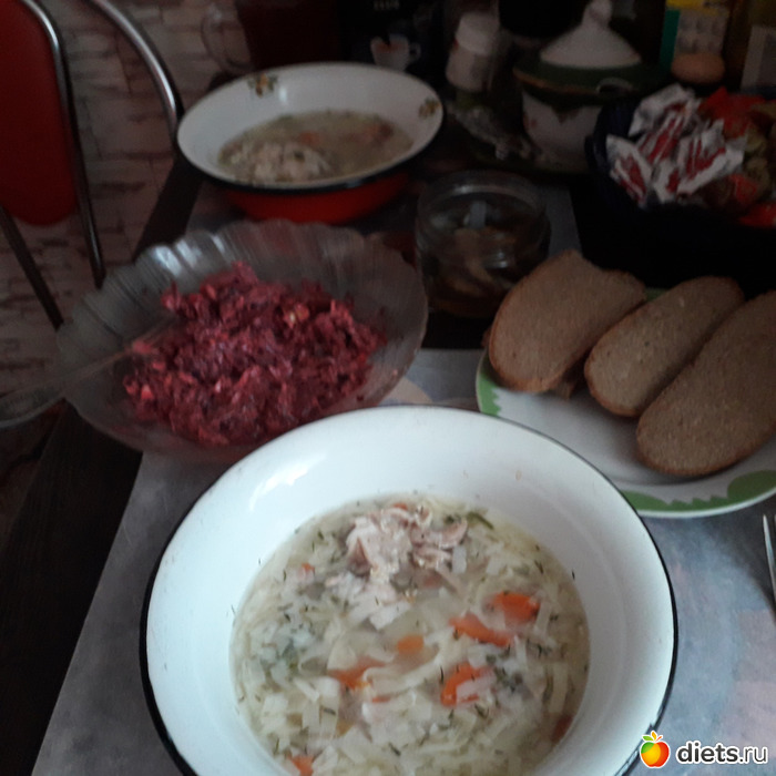 -Суп-куриная лапша, свекла с чесноком, грецкими орехами, черносливом и майонезом, компот