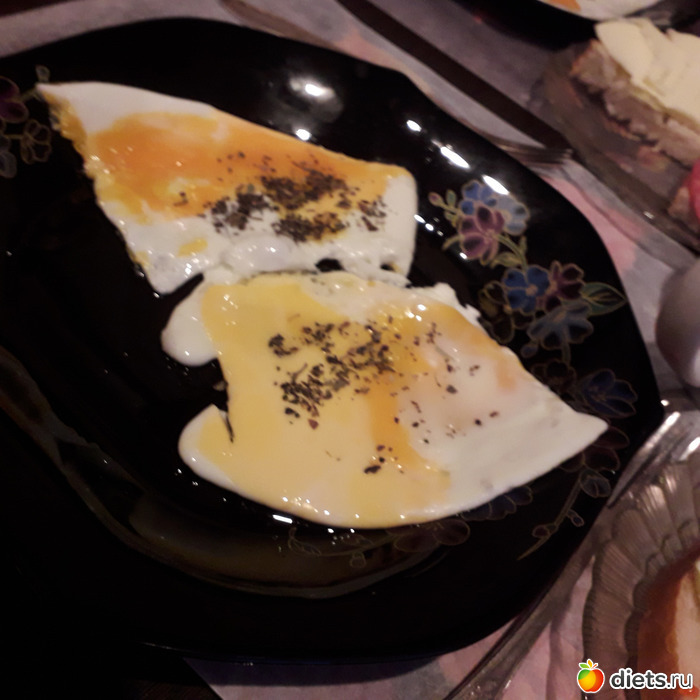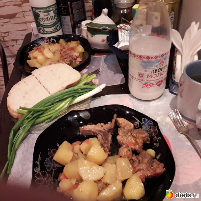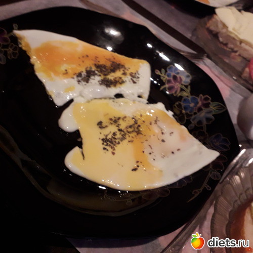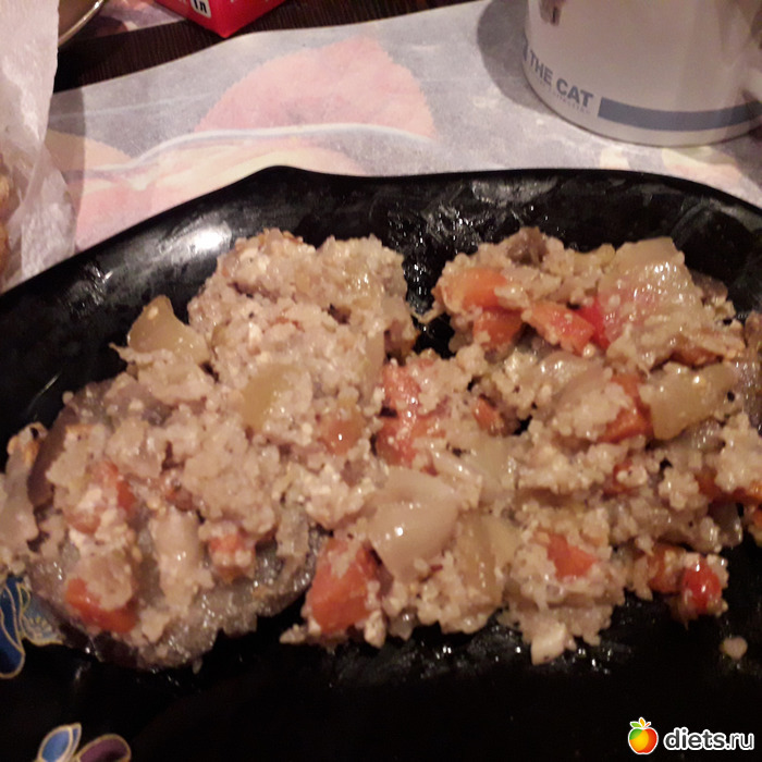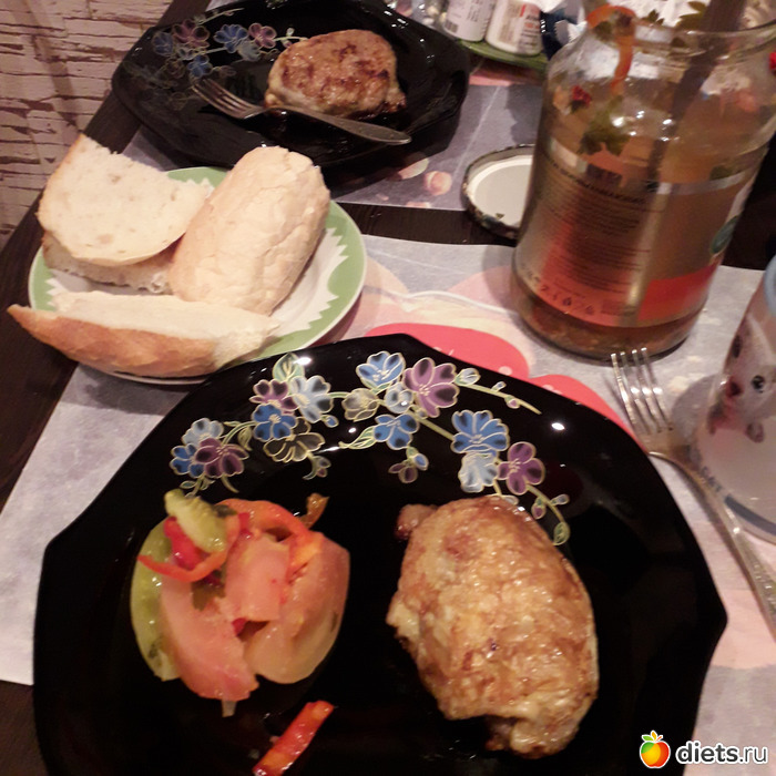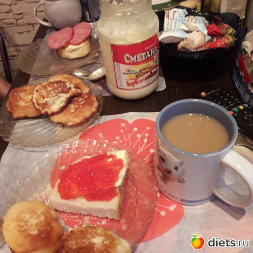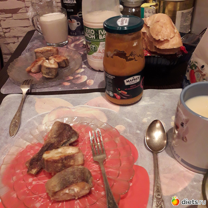 Баклажанная икра, чай с молоком-у меня, у мужа-кефир