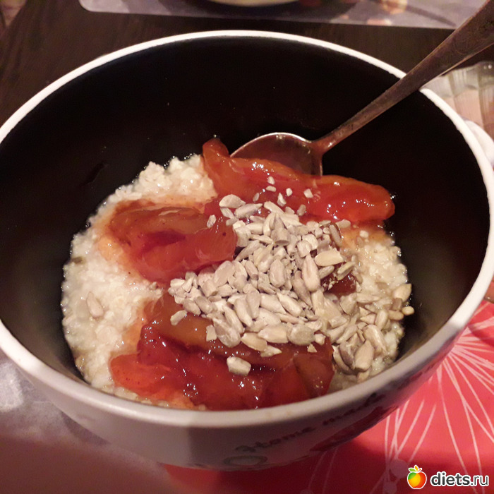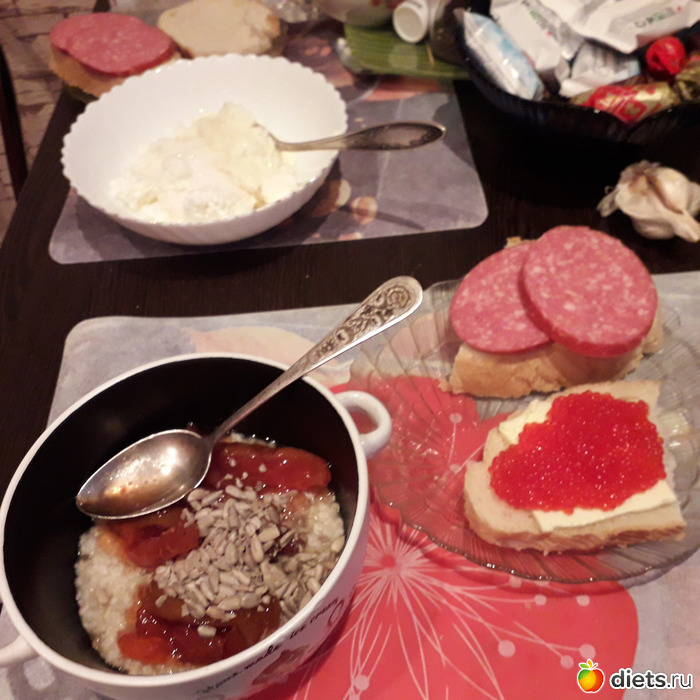 Геркулесовая каша на воде с семечками и айвовым мармеладом-у меня. Бутерброды, кофе с молоком