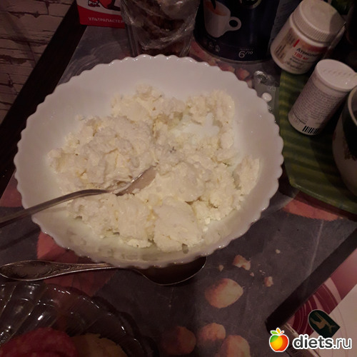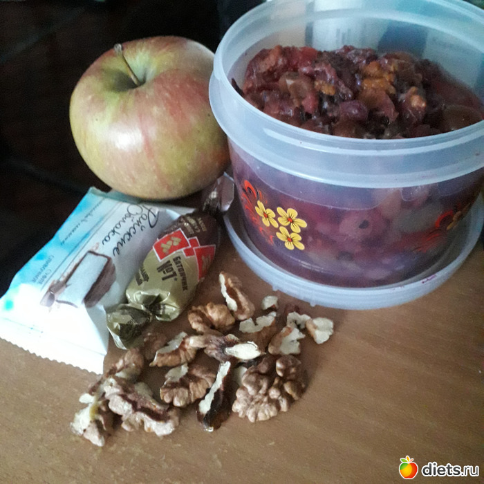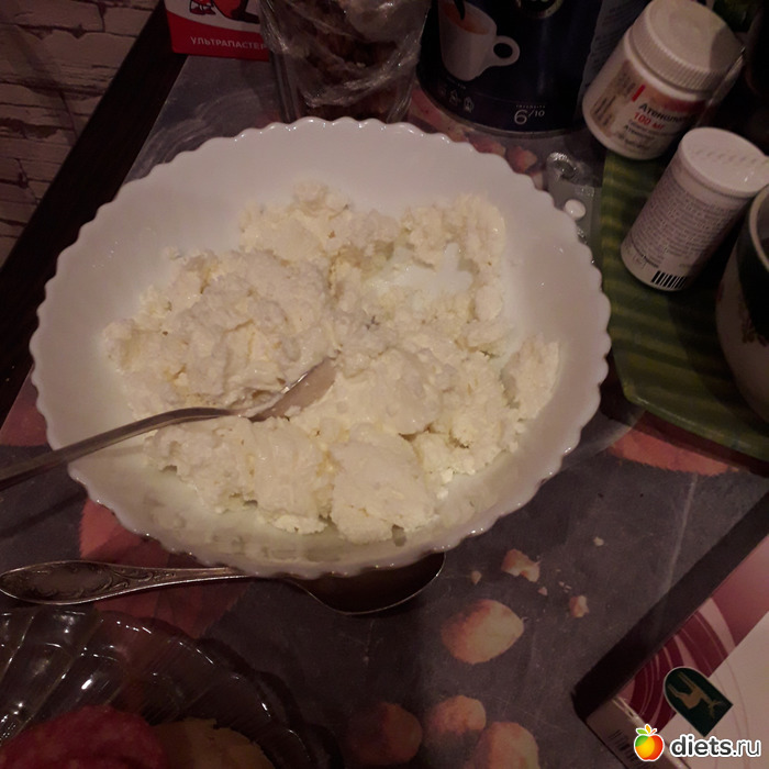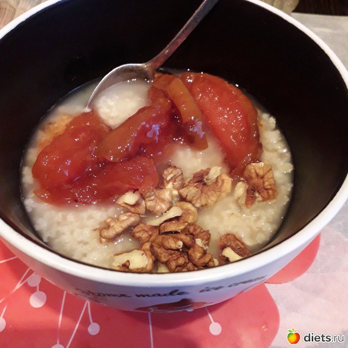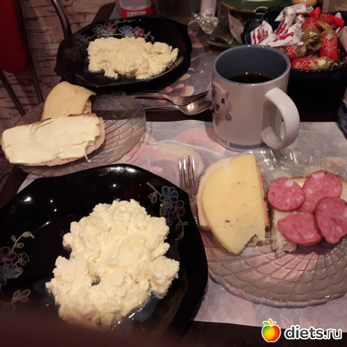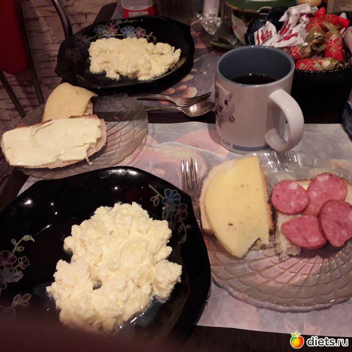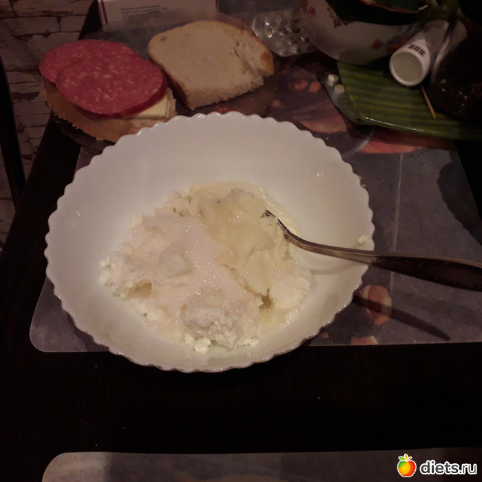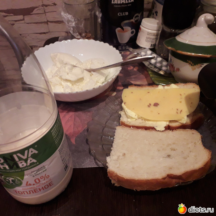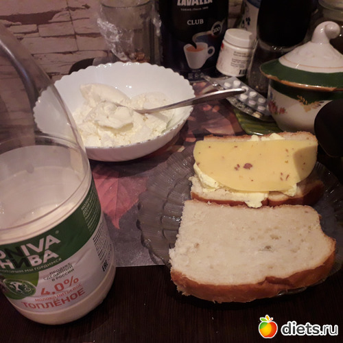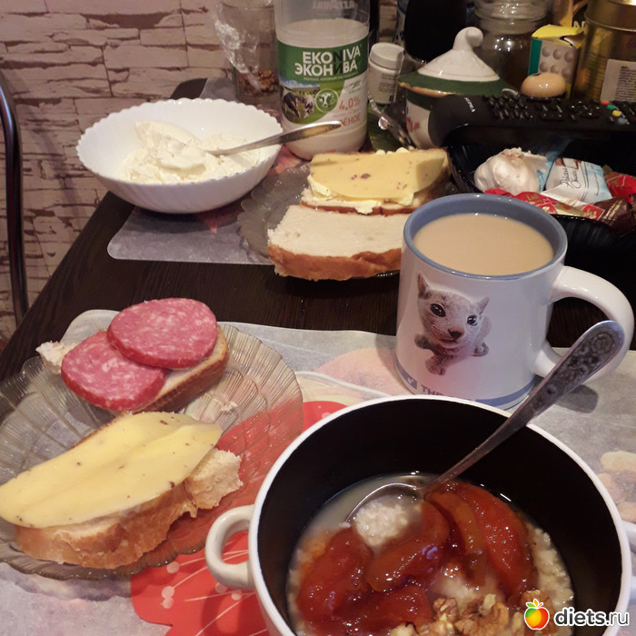 -У меня-геркулесовая каша на воде с вареньем и грецкими орехами, у мужа-домашний творог со сметаной. Бутерброды, кофе с молоком