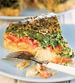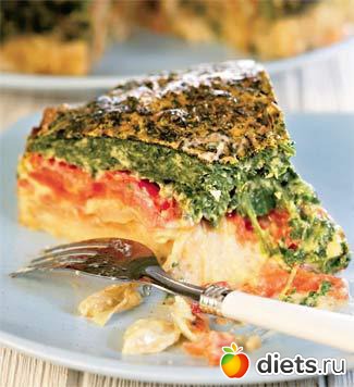 Помидоры и эстрагон вымыть и мелко порезать. Лук очистить, нарезать кольцами и обжарить в оливковом масле 3 мин. Сыр натереть на терке. Выложить помидоры на геркулесовую основу, присыпать эстрагоном. Сверху разложить кольца лука и присыпать сыром. Залить подготовленным шпинатом. Запекать в разогретой до 200 °С духовке 35–40 мин.