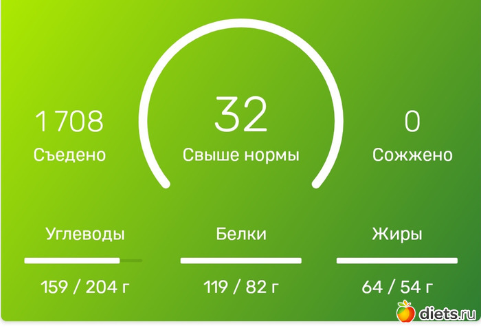 Съедено - 1708 Ккал, пройдено - 15 т. шагов,