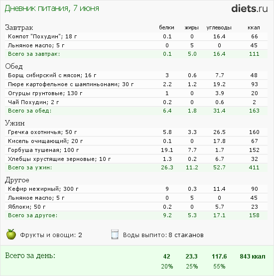 Итак, начинаю отчитываться, как и обещала. Вчера был первый день моей диеты по системе "Худеем за неделю". Меню на этот день выглядело следующим образом.