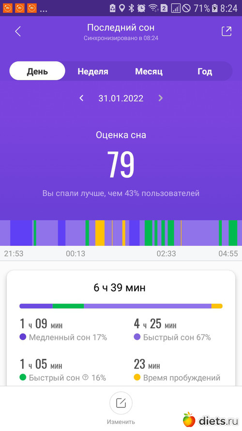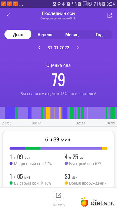 В результате по сну, просыпалась один раз не надолго. С утра голова не болела, силы на зарядку были, но петь не хотелось, сразу с кровати не смогла встать. Глубокий сон 1ч 05 мин. Хочу больше.