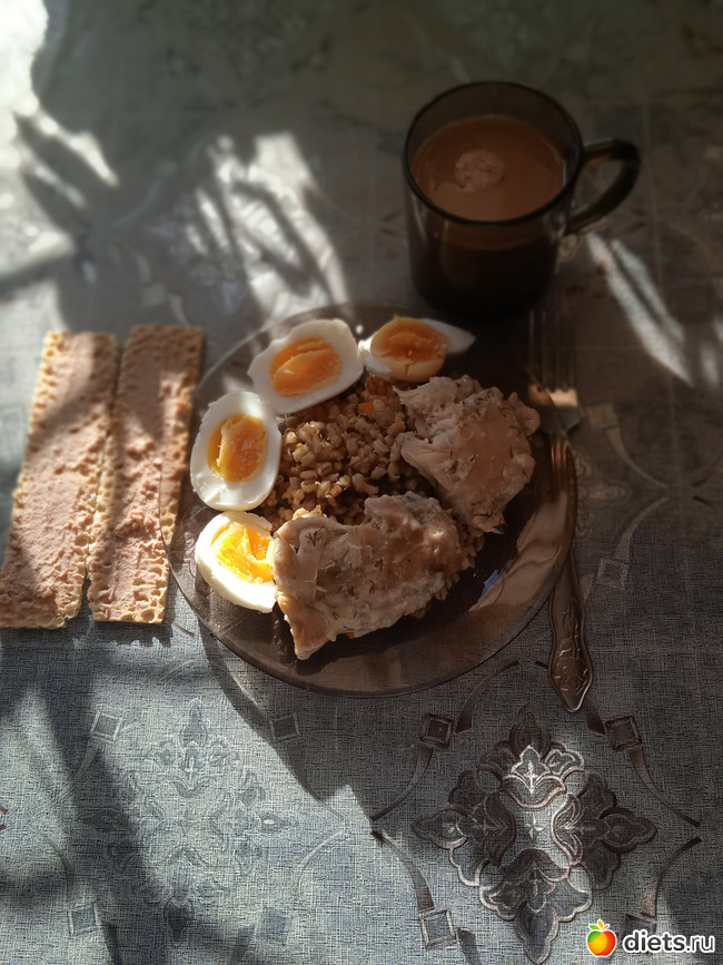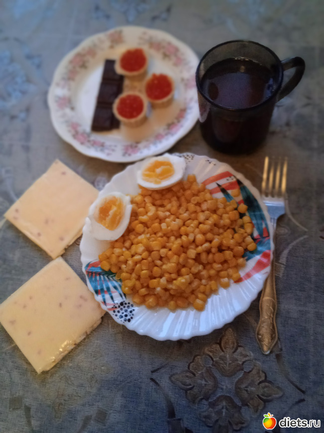 Порцию перловой каши съела половину, один кусочек мяса и 2 половины одного яйца. К тарталеткам с икрой даже не притронулась.