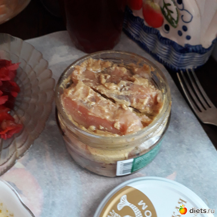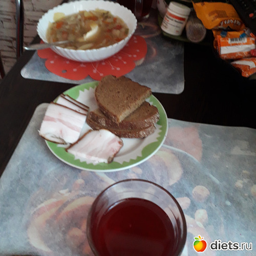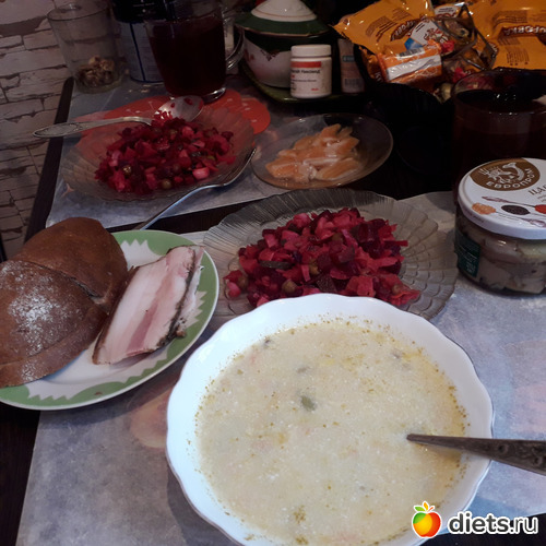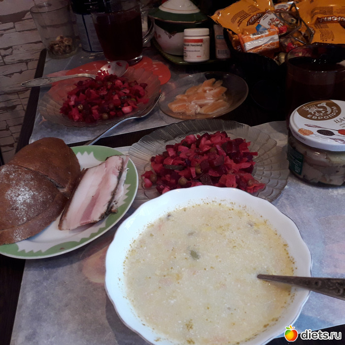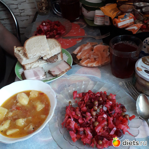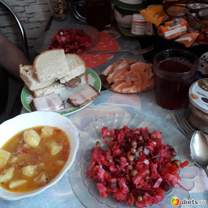 -Обед-Гриша ел щи, винегрет, брюшки семги, компот. Я-винегрет с горбушей, компот