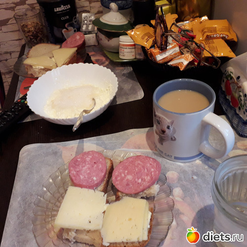 Вечером-КЧН(кто что найдет), много всего что-то. Не фоткала. Я ела вар/копч.колбасу, сыр., вчерашний Муравейник, чай с лимоном. Гриша отварил охотничьи колбаски, овощи консервированные доел. Кефир пил.