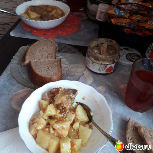 Обед-картошка с рагу, винегрет, брюшки семги, компот