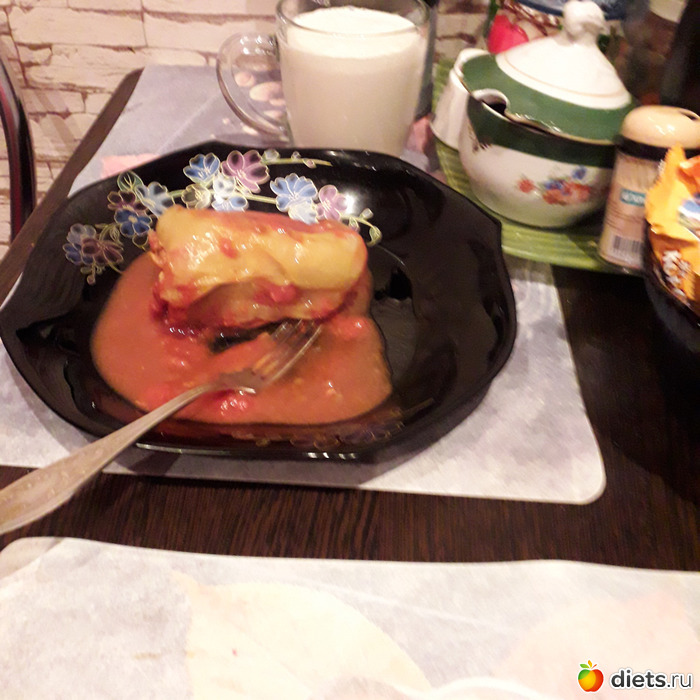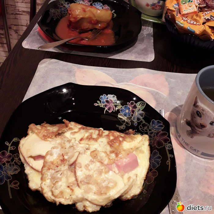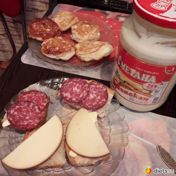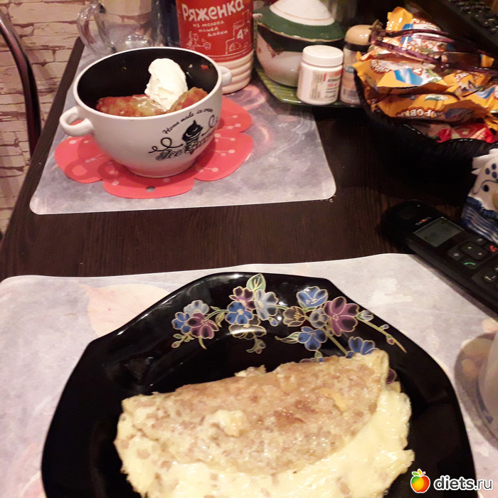 У мужа фаршированный перец, ряженка. У меня-опять овсяноблин-но с докторской колбасой и с сыром.