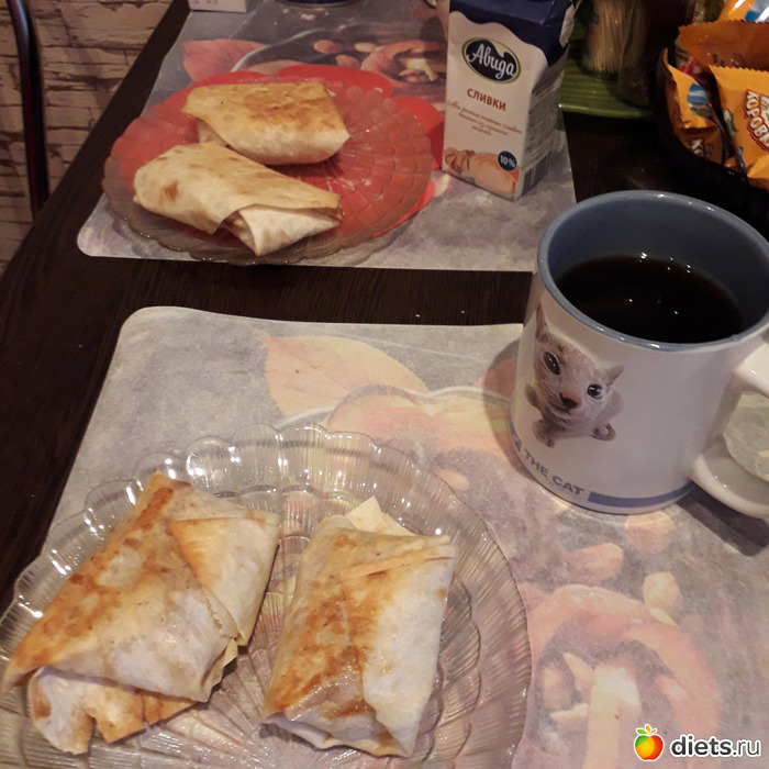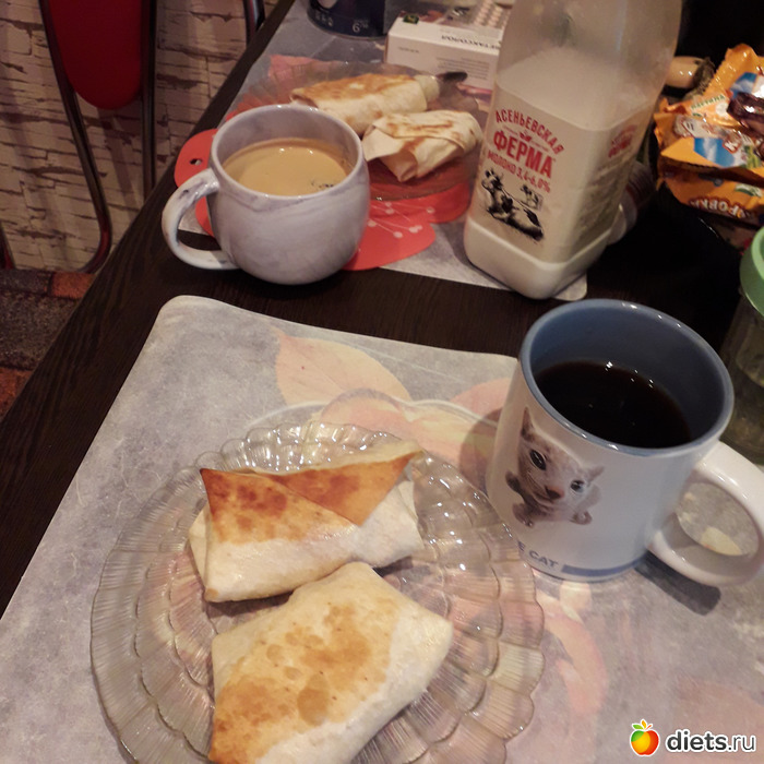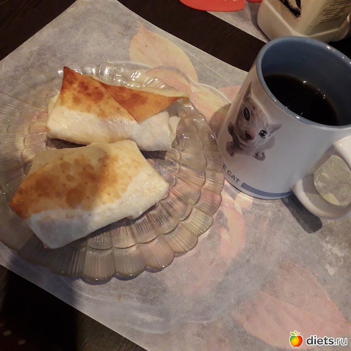 Лавашные пирожки с докторской колбасой и с сыром. Кофе с молоком(у мужа эспрессо с молочной пенкой, у меня просто черный -с молоком)