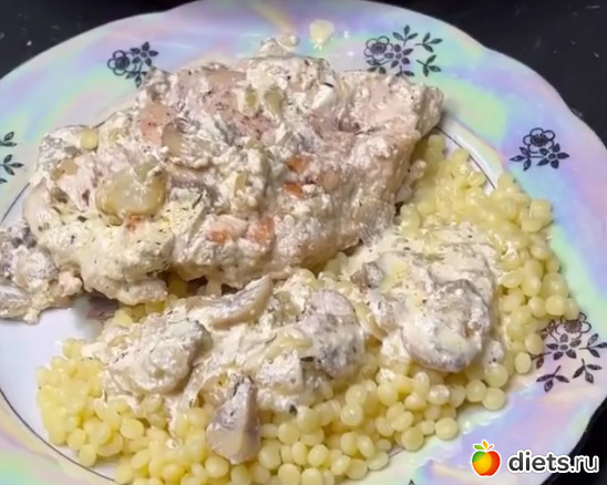 3. Заливаем стакан сливок, выкладываем курочку и тушим под закрытой крышкой 15—20 минут.