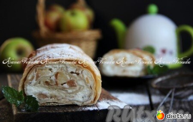 Готовый штрудель, достав из духовки, немного остудить, нарезать на кусочки и подать к чаю.