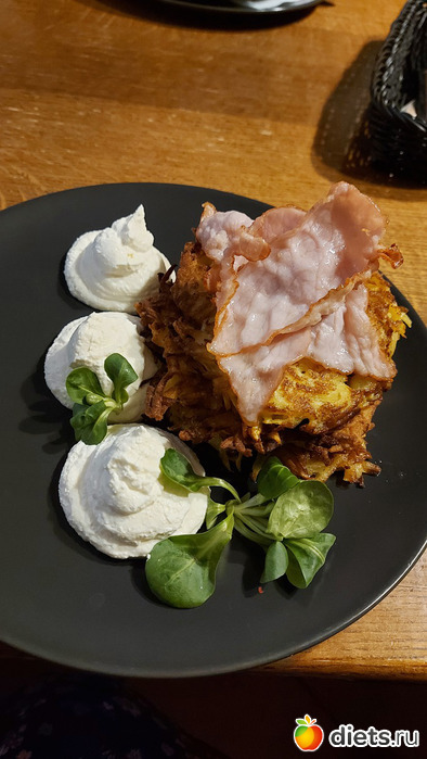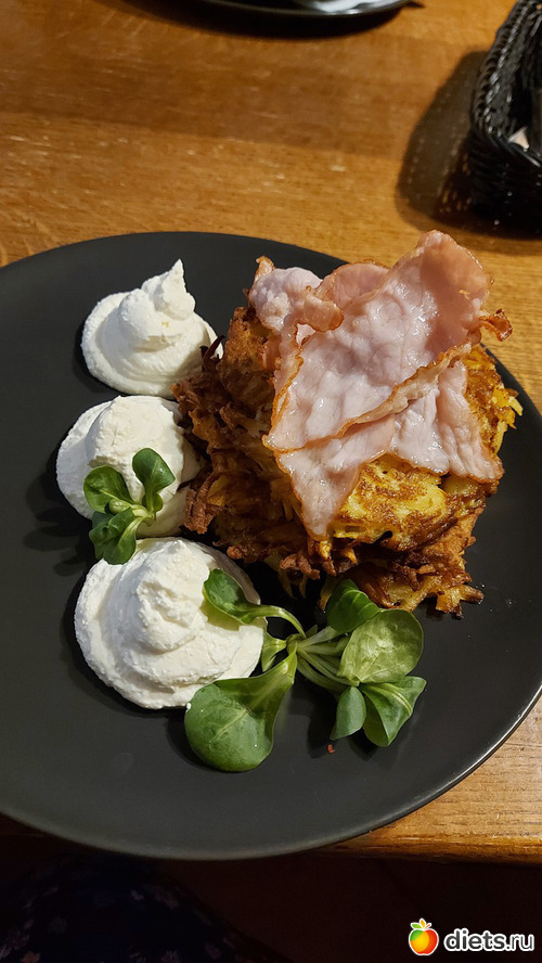 На ужин взяла себе драники с ветчиной - не очень понравились. Муж заказывал суп-гуляш и судака, сын - салат Цезарь и равиолли, доча - блины