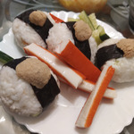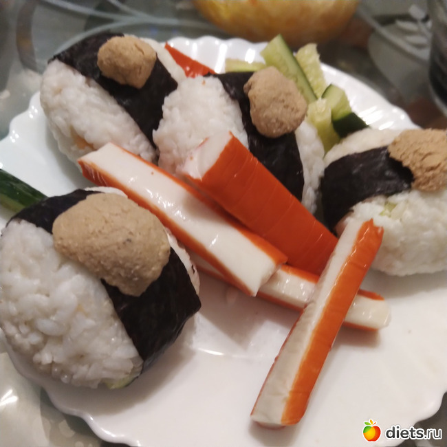 Онигири. Сегодня такие вот. Внутри форель солёная и копченая, крабовые палочки, сливочный сыр, огурец и нори конечно, которые опоясали вот рис. Мы очень любим и суши, и роллы, сашими редко делаю, как-то совсем сырая рыба - это, на мой взгляд, непросто. Совсем прям редко хе делаю, но чаще просто роллы. Вот такое делала впервые, разве что очень давно лепила их. А тут - у дочки попросила одну штучку попробовать, и нам вот налепить решила для разнообразия.