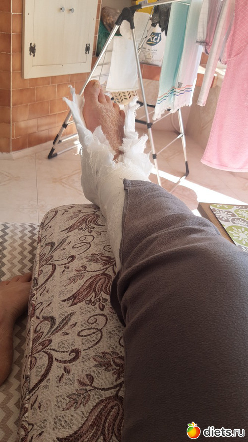 Нога похожа на змею, меняющую шкуру. Змею, похожую на сардельку. Сустав не гнется почти. По идее, чтобы его разрабатывать, надо сначала разогреть массажем (я так делала с коленом). Но гипс мешает массаж, а ещё кожа, которая шелушится. В четверг на следующей неделе будет 44 дня с момента операции, врач принимает в поликлинике только по четвергам. Мне было сказано, что на 45 день можно приехать на контроль и, скорее всего, снять уже гипс. Думаю, что не стоит ждать ещё неделю, попробую уговорить отвезти меня в следующий четверг..
