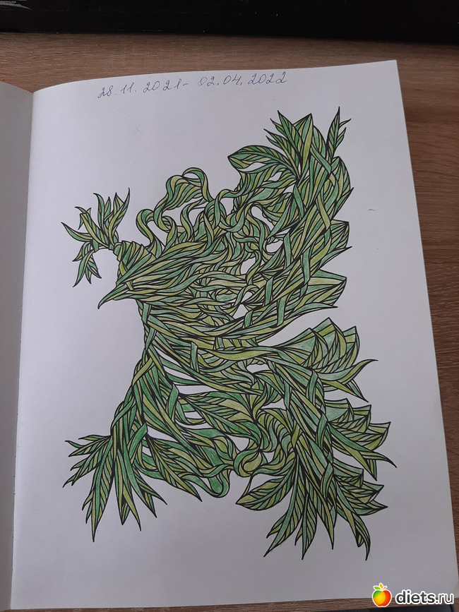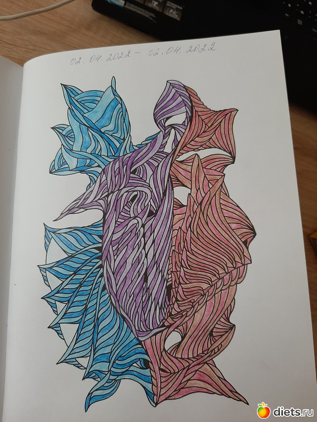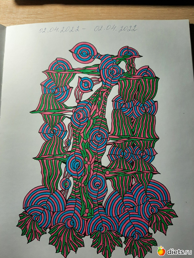 А под него достала свою уже многолетнюю раскраску с дудлами, закончила старый, сделала 2 новых рисунка, один, ради эксперимента, раскрасила фломастерами, неплохо так получилось