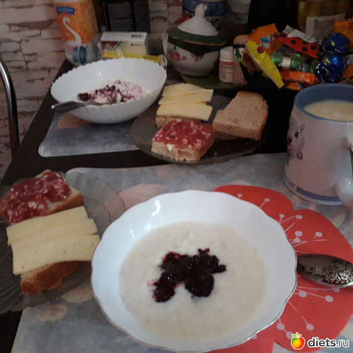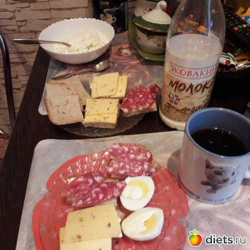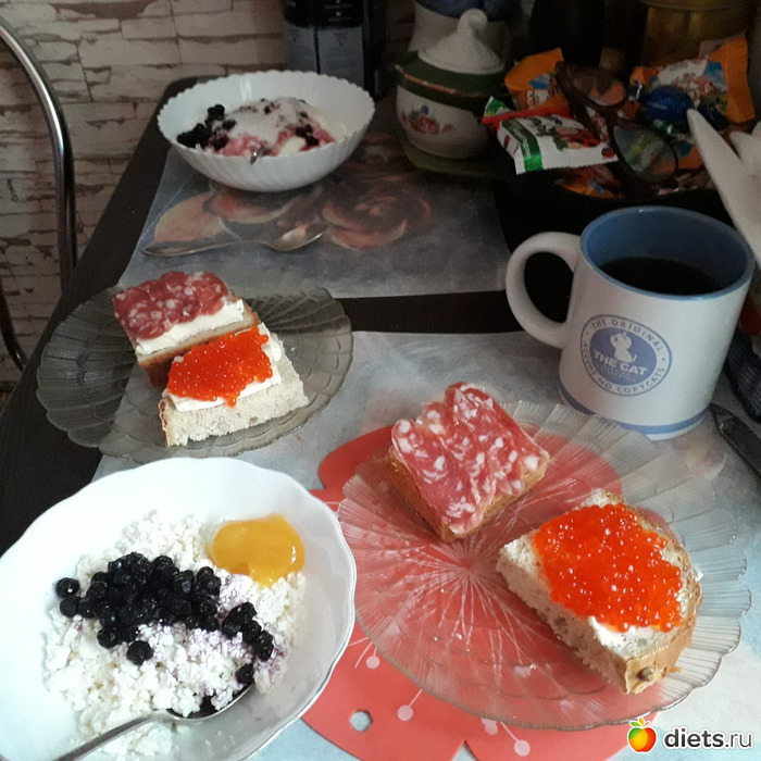 У Гриши-творог зерненый со сметаной+бутерброды+кофе. У меня-яйцо под майонезом, бутерброды, кофе