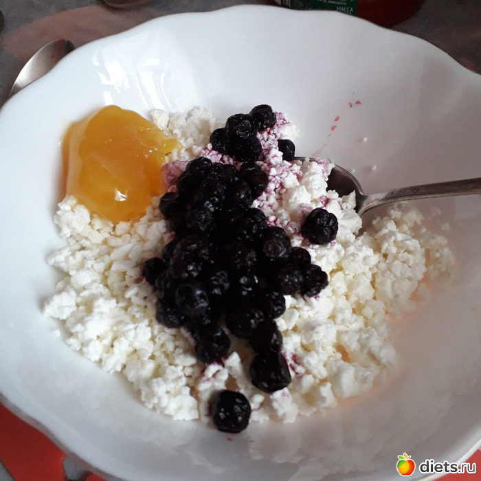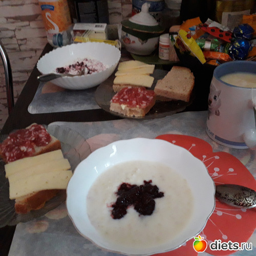 У меня-каша пшенная, молочная, с ягодами ежевики. У мужа-домашний творог со сметаной и с ежевикой.