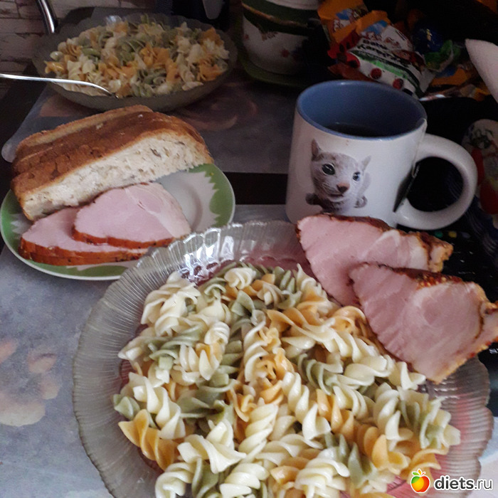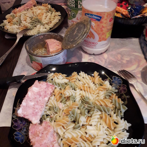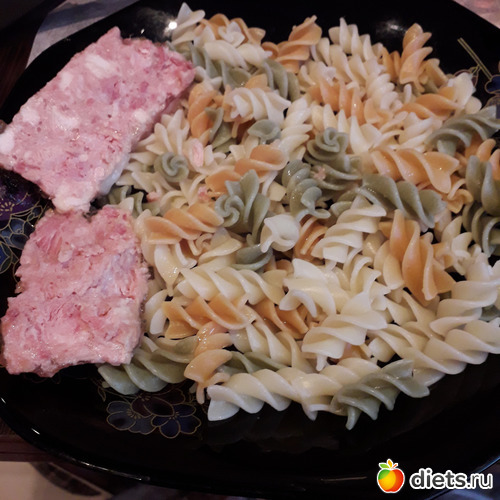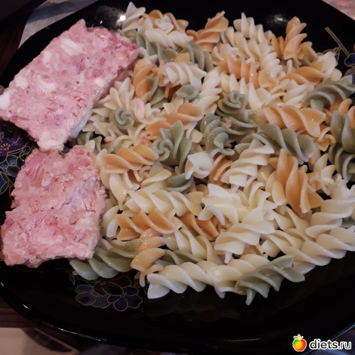Макароны(трехцветные) с ветчиной рубленой-баночной(муж захотел такой ужин)