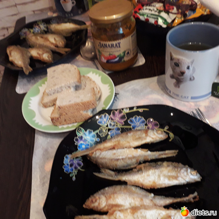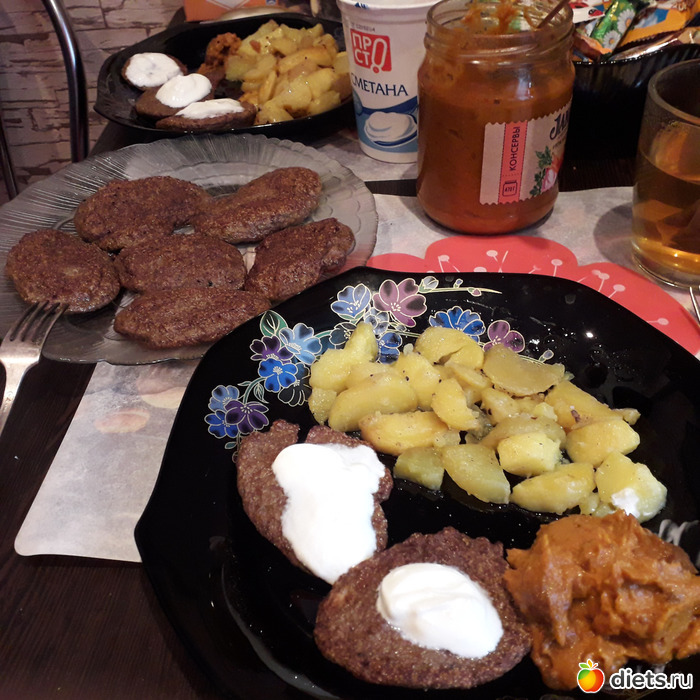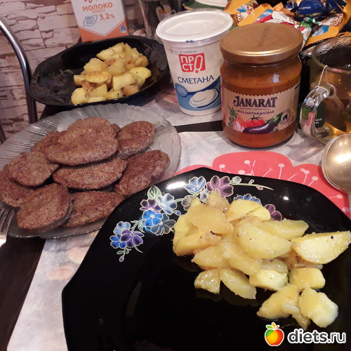 Картофель, печеночные оладьи, икра баклажанная. У меня -зеленый чай, у мужа-топленое молоко