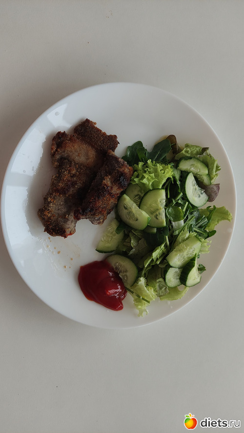 У - салат из зелени и огурца с лаймом и оливковым маслом, мясо.