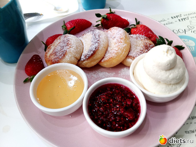 Сырники с крем-чиз, медом, малиновым конфитюром и клубникой.