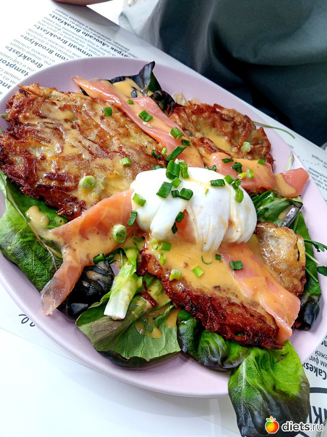 Картофельные, если не ошибаюсь криспи с лососем и каким-то там яйцом на подушке из зелени. По факту криспи оказались драниками, но, как говорится, гренка не может стоить пять баксов, а крутон может