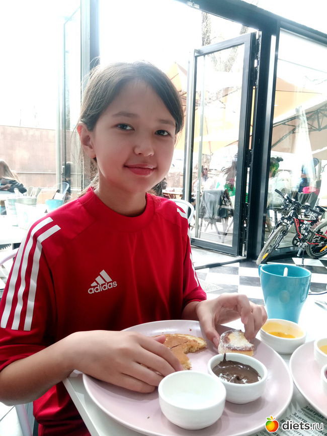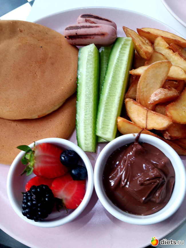 Панкейки с нутеллой и чего-то там еще, заявлен как детский завтрак.