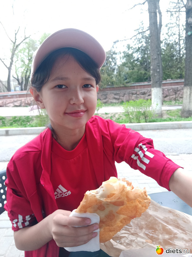 Довольная девочка с чебуреком, зацените размер.